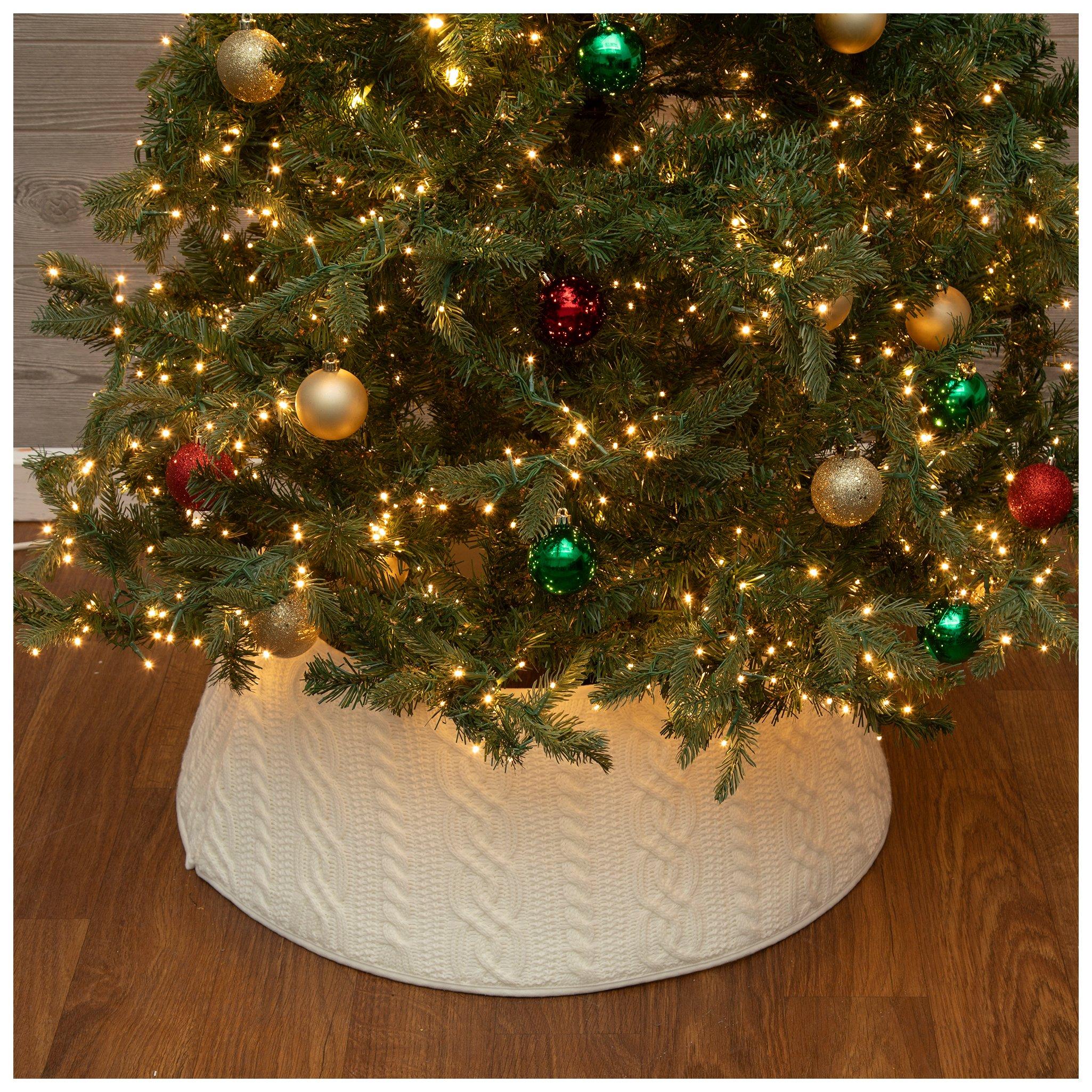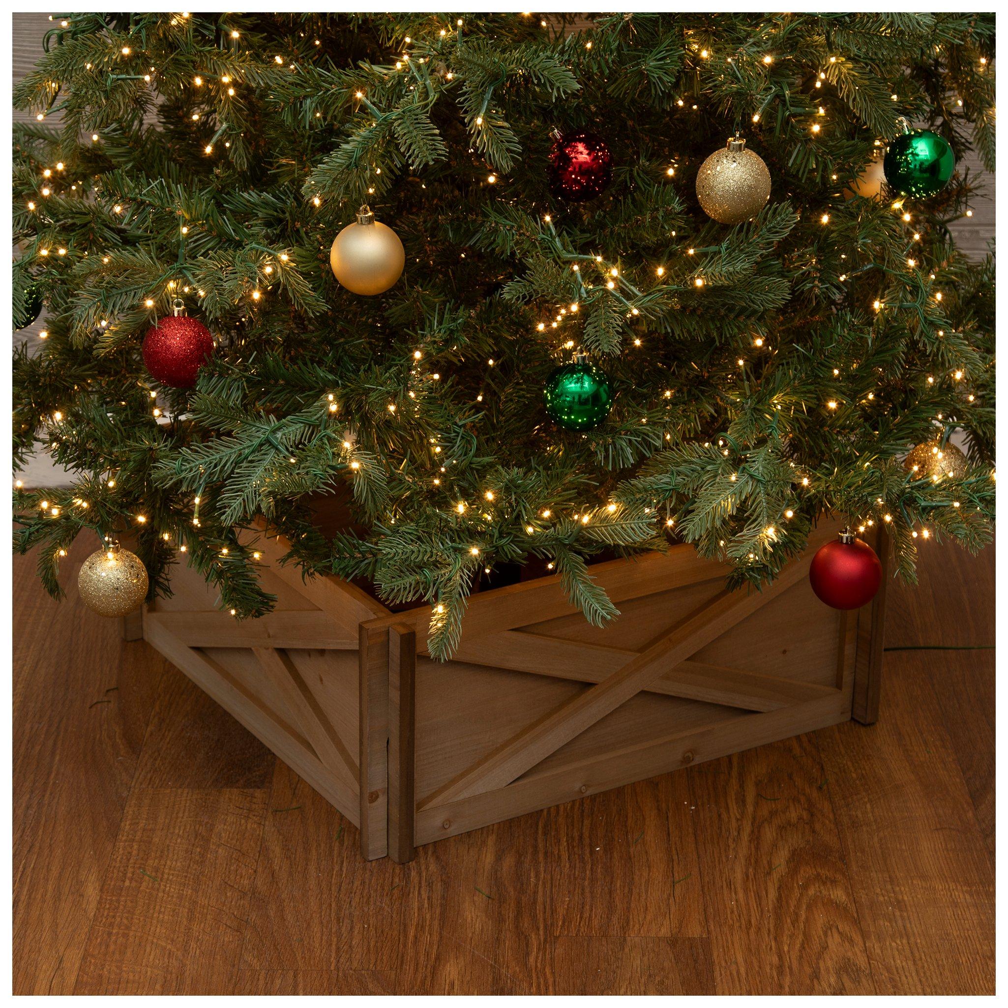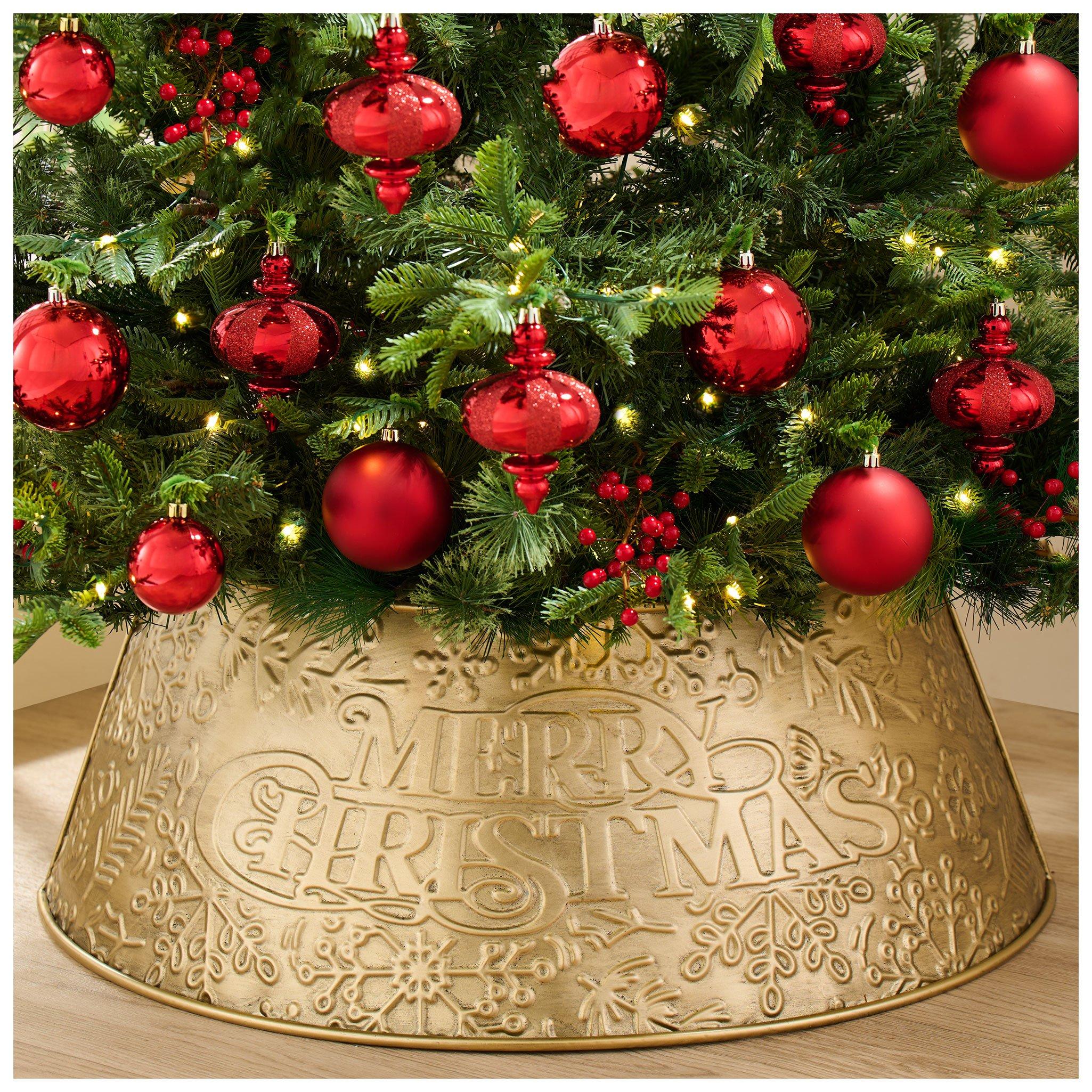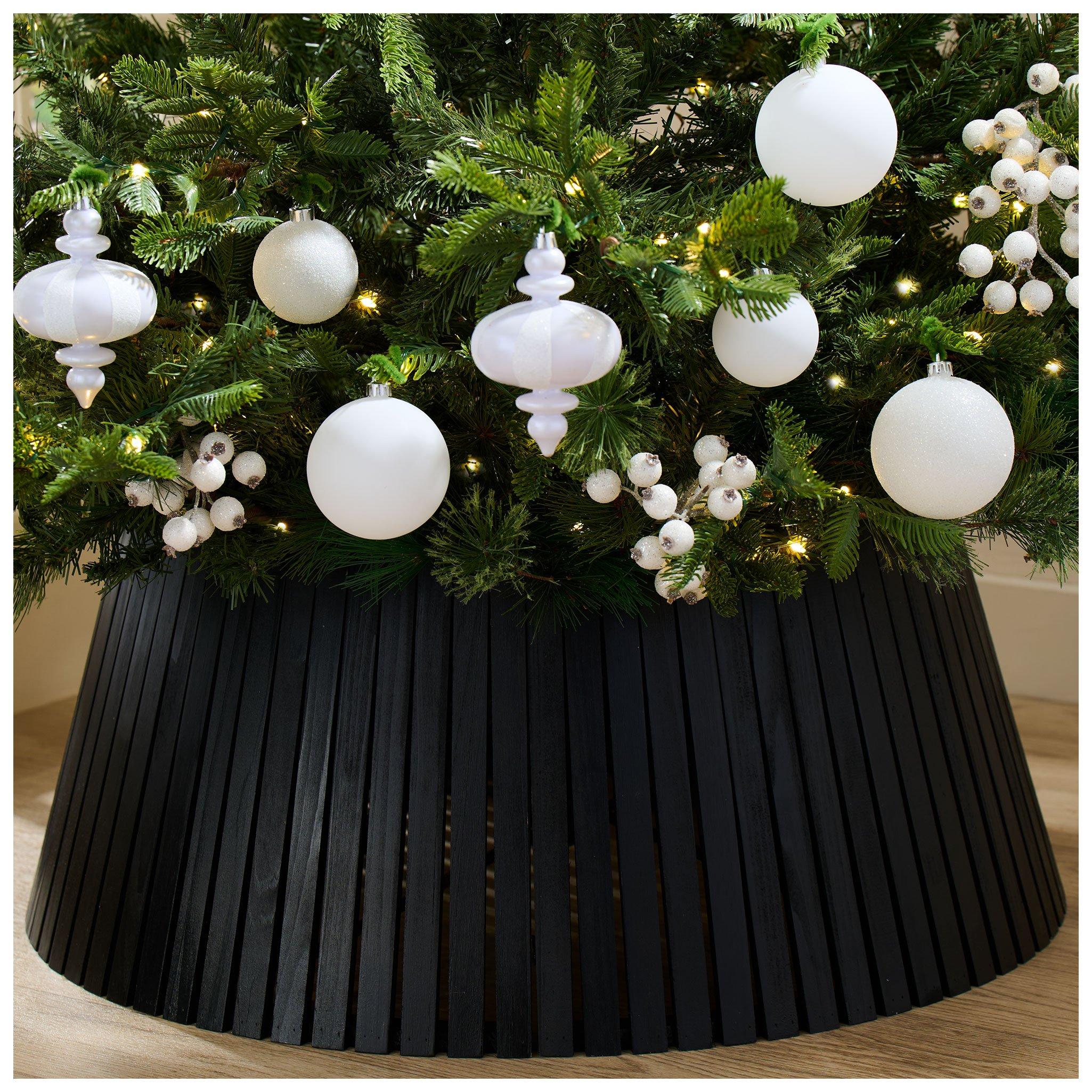 Make your Christmas tree complete from top to bottom by wrapping it with a Christmas tree collar or skirt! These traditional accents are great for tying together your holiday decor. Tree collars go around the base of tree. Their detachable sections can easily be wrapped around the stand without lifting the tree. Tree skirts serve as an excellent backdrop for presents Make either a part of your picture-perfect Christmas morning scene. Select a piece that will match your Christmas decorations. If decorating with bright ornaments, complement them with a fabric tree collar in bold red. Use a plaid tree collar to invoke warm feelings of nostalgia. If you have a farmhouse home, a rustic plaid or check tree skirt will also fit nicely. Or, add to the farmhouse beauty with a wooden tree collar. Then, place wooden ornaments on the tree for a cohesive look. For a modern interior, a solid white tree skirt is a good choice. Want a more modern farmhouse design? Try a braided water hyacinth collar. This will incorporate a natural element that breaks from the classic Christmas colors. Transform your living room into a Christmas village by adding a woven tree collar. Its texture offers contrast against a traditional green tree. To create a fun and whimsical look, pair your grinch Christmas tree with a matching grinch tree skirt! Use a black metal tree collar to make colorful gifts stand out. Pair that black tree collar with flocked decorations and white ornaments for a classic black and white look. A poinsettia or scalloped tree skirt creates a distinct yuletide scene, while a faux fur tree skirt inspires a cozy winter atmosphere. Whether decorating an artificial or natural tree, enhance your design with dapper Christmas tree decorations!