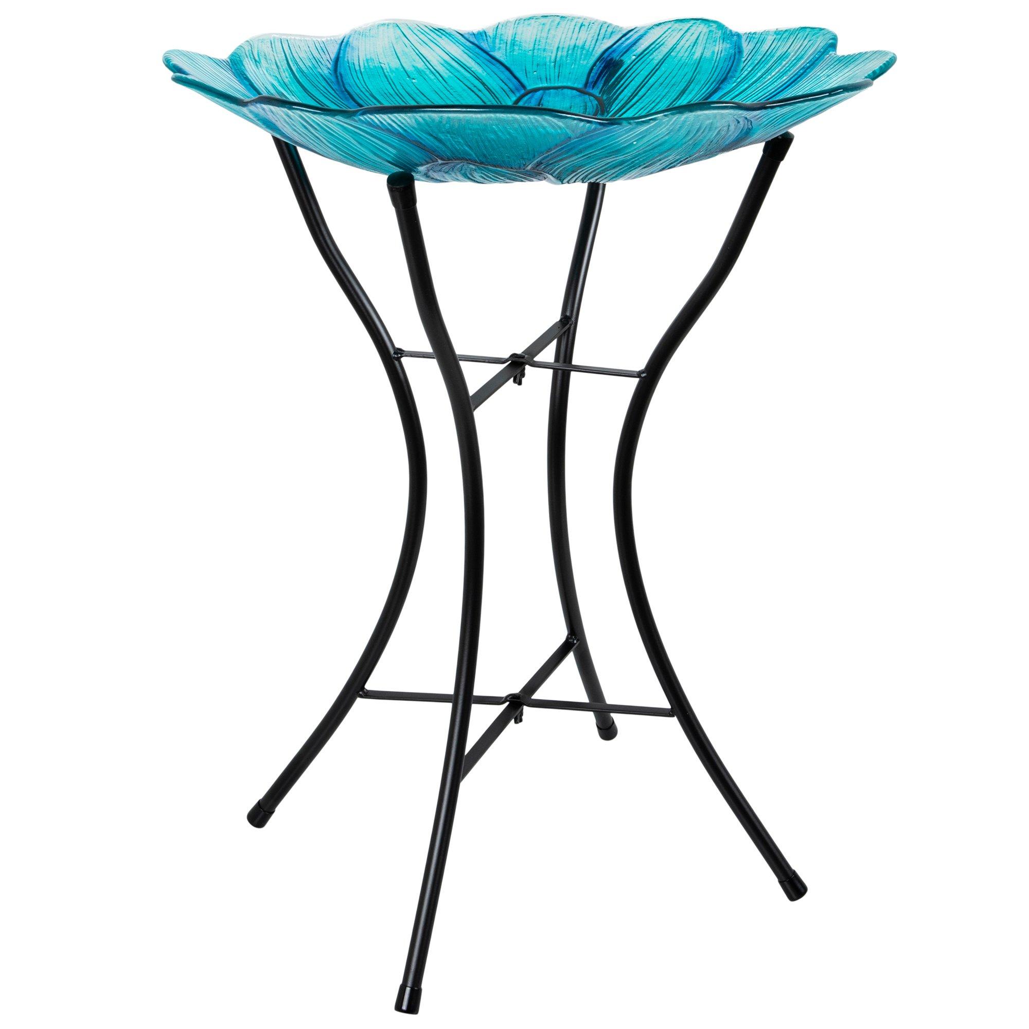 Our glass bird bath bowls feature garden-inspired designs embossed on the glass bowl. Some are shaped like a flower. Others are round and feature charming designs, like a butterfly, bees, or a hummingbird. The bowl sits on a black metal stand that helps to elevate and emphasize the designs, which boast vibrant colors in the sunlight.